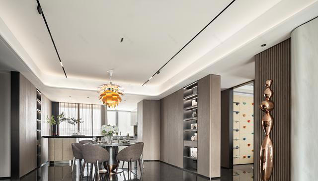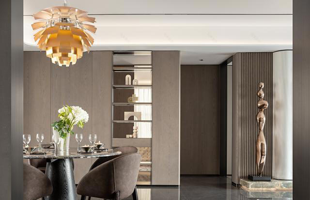 餐厅是家庭仪式的焦点。圆形餐桌居中而立,寓意团圆与和谐,搭配深棕或灰色绒面餐椅,坐感与质感俱佳。餐桌上方,造型独特的金色或橙黄色吊灯宛如绽放的花朵,成为视觉焦点,灯光透过金属或片状结构温柔滤下,为每一餐注入恰到好处的氛围。背景墙的浅木色橱柜与开放式陈列架,既满足了收纳,也将主人的收藏与品味优雅展示。晨光透过纱帘洒入,夜晚灯光氤氲,三餐四季在此化为值得珍藏的时光。
