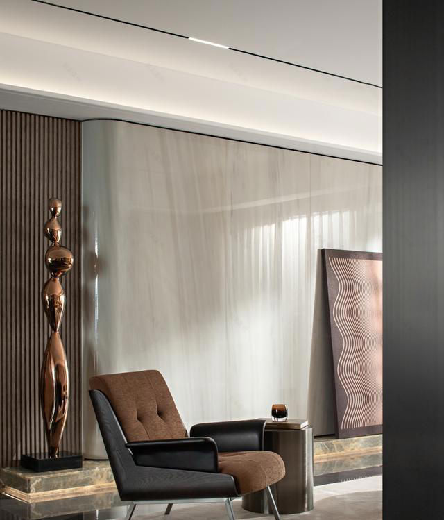 视线所及,皆是静谧与力量的对话。暖灰色调的背景墙,巧妙融合了竖条纹肌理的深邃与光滑墙面的宁静,构成沉稳的基底。一尊尊铜色抽象雕塑静立于角落,或由球体堆叠,呈现凝练的张力;或以流畅线条勾勒人形,散发沉思的气质。它们不仅是装饰,更是空间精神的锚点,与一旁质感卓然的黑棕配色休闲椅、简约的黑色沙发椅低声共鸣,营造出一处处可独处、可冥想的艺术角落。