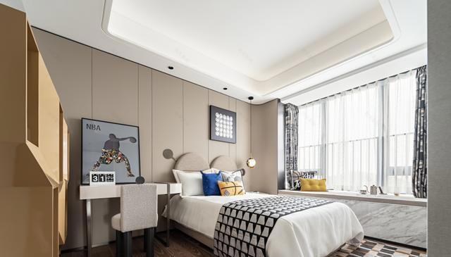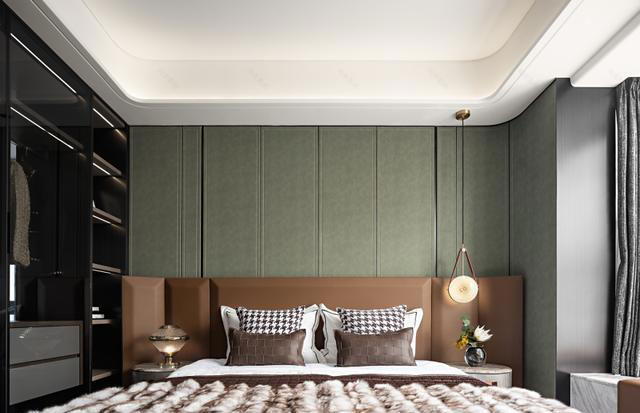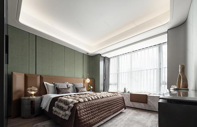 主卧是一片宁静的绿洲。沉稳的棕色宽厚床头奠定安眠的基调,绿色背景墙带来一抹自然生机。柔软的床品与格纹抱枕邀请着彻底的放松。飘窗区改造为大理石台面的休闲一隅,可坐观城市夜景或沐浴午后暖阳。每一处细节,从床头阅读灯到地面的浅灰地毯,都只为营造极致舒缓的归宿感。