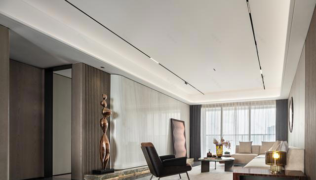 客厅格局舒朗,浅灰色沙发组合承载着身体的松弛,其上色彩与纹理相异的抱枕,增添了几抹柔软的层次。圆形茶几与边几上的台灯、花瓶、书籍,共同编织着日常的温情。线性灯带与轨道射灯替代了传统主灯,光线如洗,均匀洒落,在材质丰富的空间里描摹出明暗轮廓,夜晚时分,更烘托出一室温馨静谧。